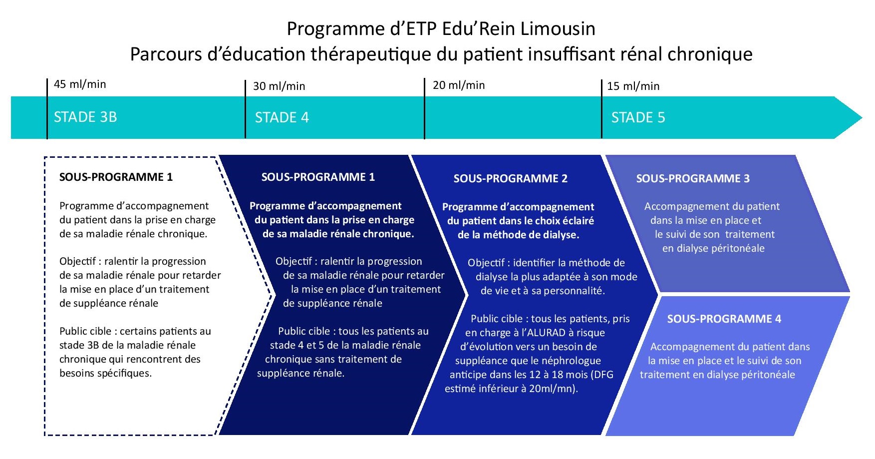 EDU’REIN LIMOUSIN est le service d’éducation thérapeutique du patient (ETP) de l’Alurad. EDU’REIN LIMOUSIN a pour ambition de proposer aux patients insuffisants rénaux chroniques un parcours global d’ETP de l’annonce de la maladie rénale à la prise en charge du patient en insuffisance rénale chronique terminale.